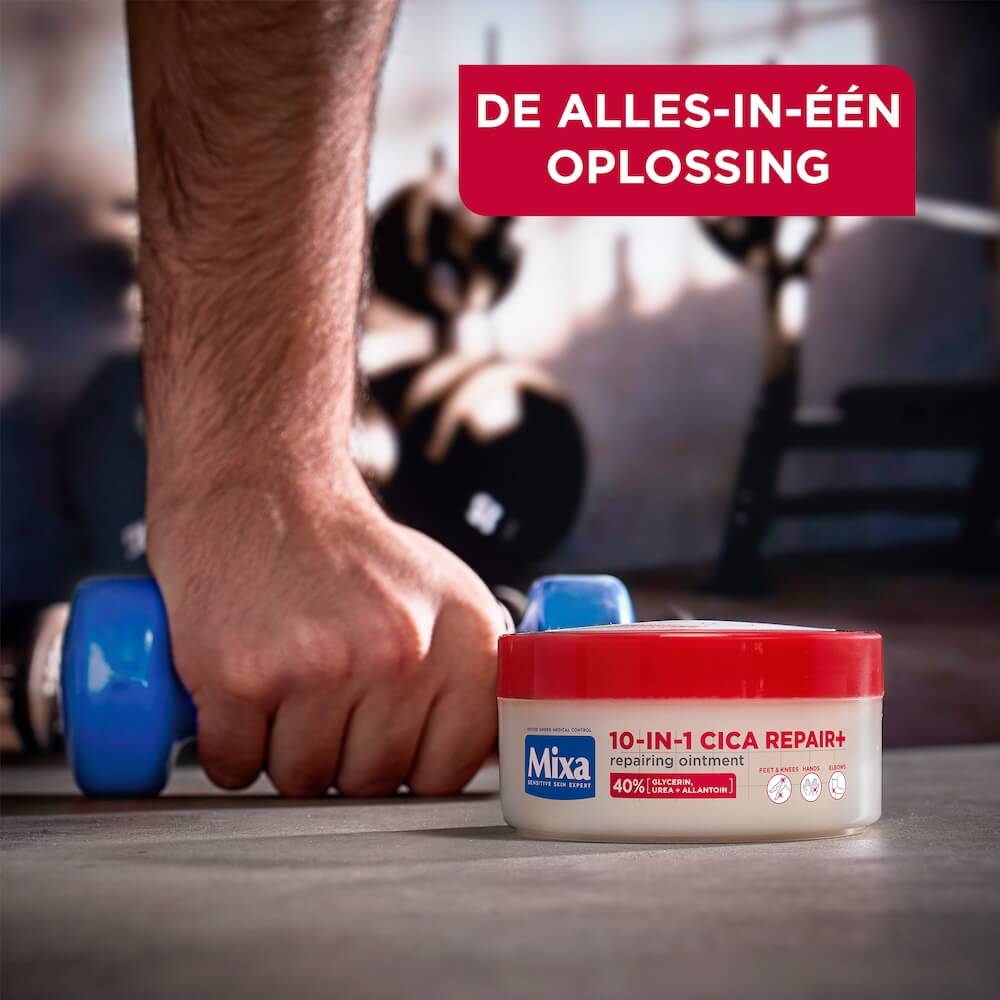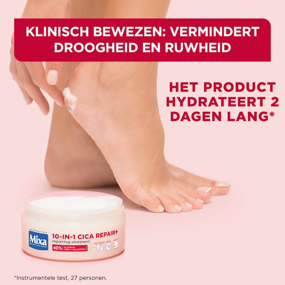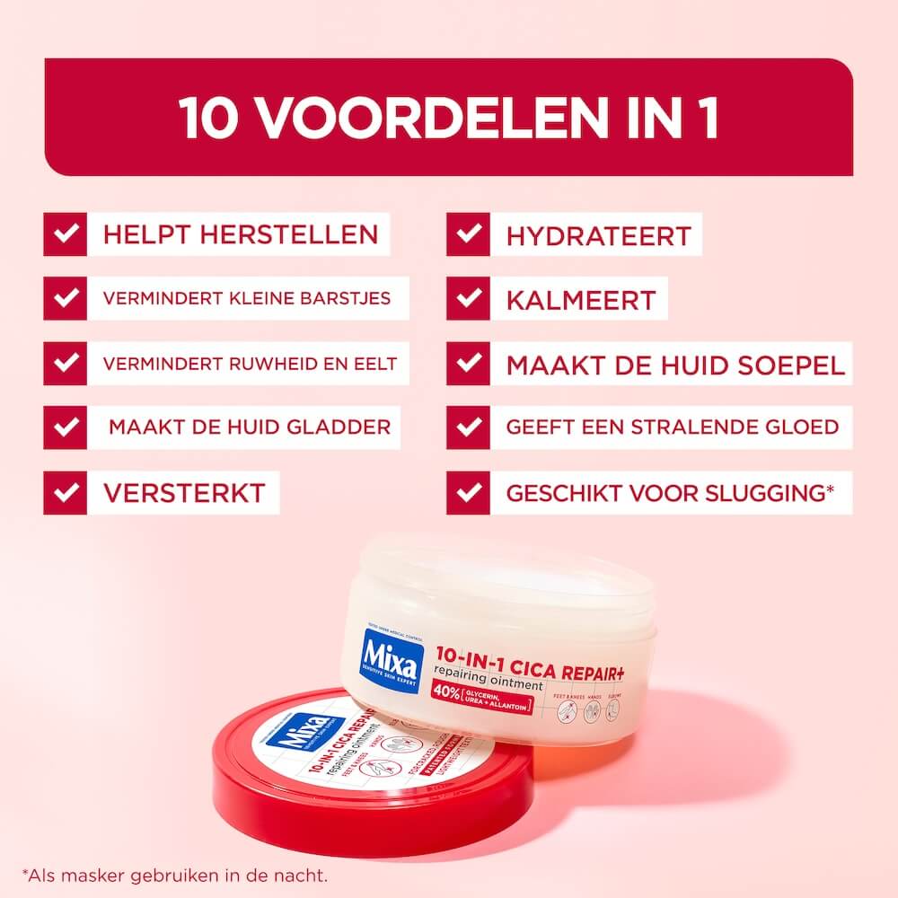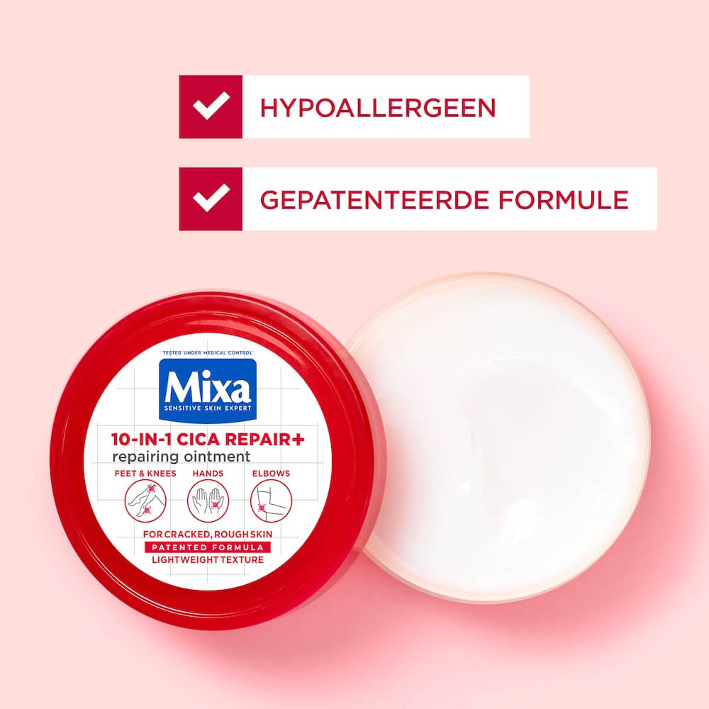 - Mixa 10-in-1 Cica Repair+ herstelondersteundende zalf helpt droge, gebarsten huid herstellen met 40% glycerine, urea en allantoïne. Klinisch bewezen: vermindert droogheid en ruwheid op ellebogen met 68%* en hydrateert 2 dagen lang**. Deze innovatieve gepatenteerde formule biedt 10 voordelen in één product: helpt herstellen, vermindert kleine barstjes, vermindert ruwheid en eelt, maakt de huid gladder, versterkt, hydrateert, kalmeert, maakt de huid soepel, geeft een stralende gloed en is geschikt voor slugging als nachtmasker.