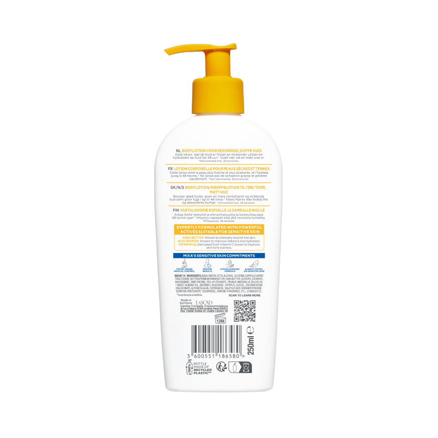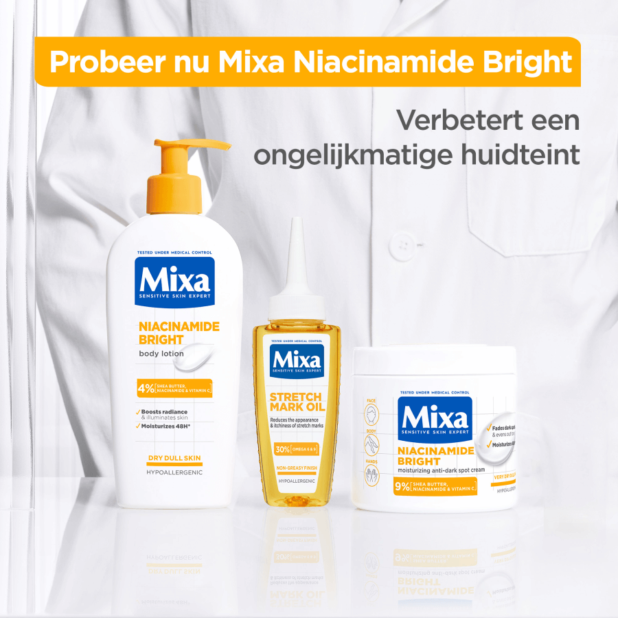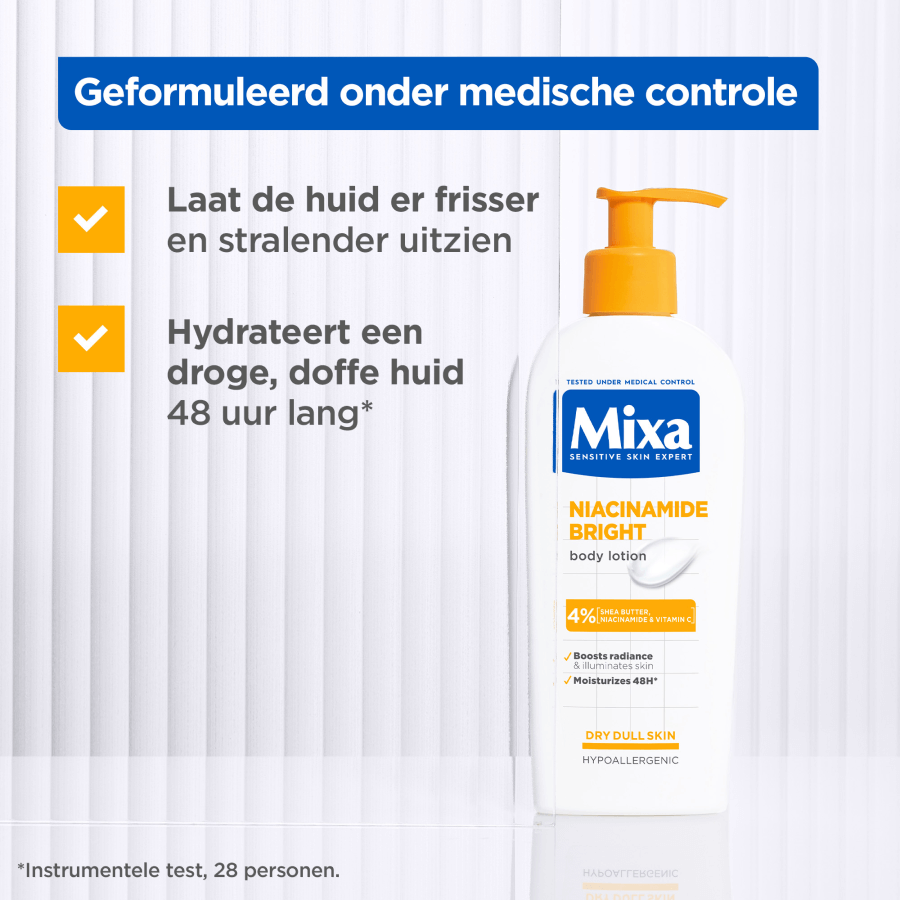- De Mixa Niacinamide Bright Bodylotion is speciaal ontwikkeld voor de droge, doffe huid die een stralende verzorging nodig heeft. De geavanceerde formule, verrijkt met 4% [SHEABOTER, NIACINAMIDE & VITAMINE CG], laat de huid er frisser en stralender uitzien. Niacinamide staat er om bekend dat het de huid laat stralen en helpt de huid beter haar eigen vocht vast te houden. Sheaboter voedt de huid intensief en vitamine Cg, een afgeleide van vitamine C, egaliseert de huidteint en laat deze stralen. Het resultaat? De huid voelt 48 uur lang gehydrateerd, verzacht en beschermd aan.* De bodylotion trekt snel in en voelt niet vet aan. De huid ziet er egaler en stralender uit vanaf het eerste gebruik. 74% van de gebruikers ziet een verbeterde uitstraling van de huid na 4 weken gebruik.** De lotion is hypoallergeen geformuleerd onder medische controle. Zo weten we zeker dat het geschikt is voor een gevoelige huid. De formule bevat een subtiel parfum met zonnige noten, witte bloemen, romige musk en frisse citrus.