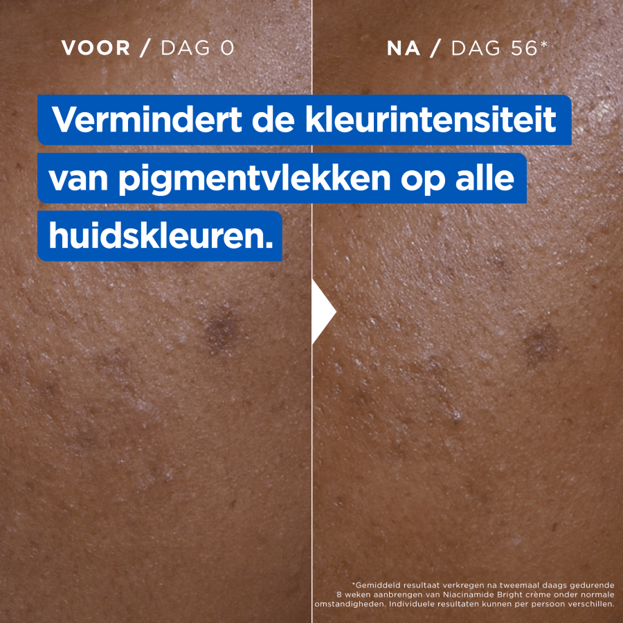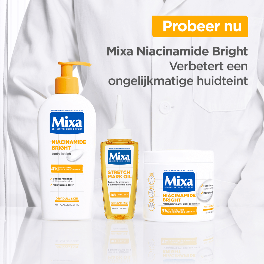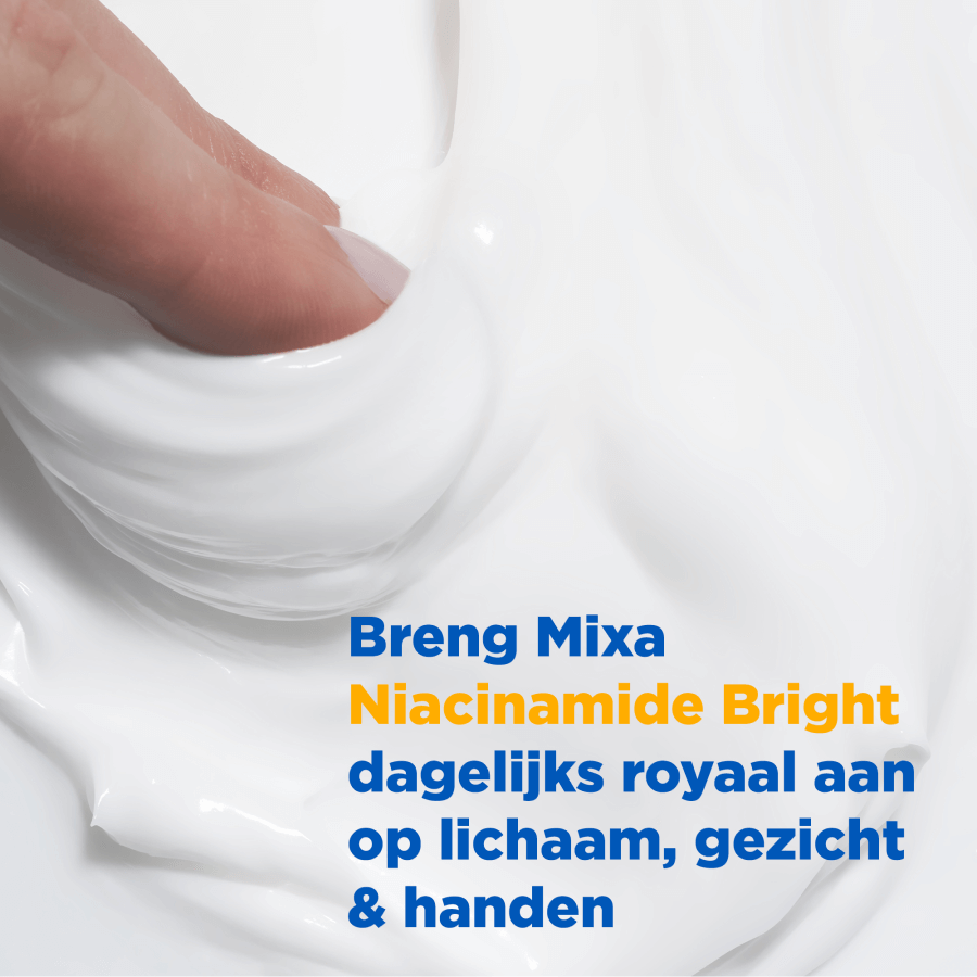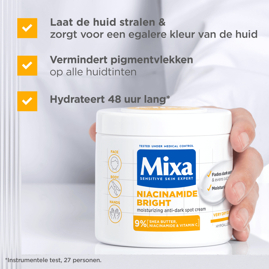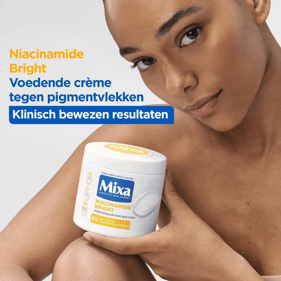 - Mixa Niacinamide Bright is een voedende crème speciaal ontwikkeld voor de zeer droge, doffe huid met pigmentvlekken, vaak veroorzaakt door blootstelling aan de zon, huidveroudering of onzuiverheden. Deze huid herken je aan donkere vlekjes op bijvoorbeeld het gezicht, de handen en het lichaam. Meestal ziet de huid er ongelijkmatig en dof uit. De crème helpt pigmentvlekken te verminderen en laat de huid stralen vanaf het eerste gebruik. De geavanceerde formule is verrijkt met 9% [SHEABOTER, NIACINAMIDE & VITAMINE Cg] en helpt de huid herstellen. Niacinamide vervaagt namelijk pigmentvlekken en helpt de huid beter haar eigen vocht vast te houden. Daarnaast helpt de formule, met sheaboter, de huid intensief te voeden en met vitamine Cg de huidteint te egaliseren voor een stralende gloed. Niacinamide Bright is klinisch bewezen effectief. Het vermindert de kleurintensiteit van pigmentvlekken op alle huidskleuren en laat de huid stralen. De crème hydrateert de huid 48 uur lang* en zorgt ervoor dat 88% van de gebruikers hun algehele huidconditie zag verbeteren na 56 dagen**. Tegelijkertijd voedt Niacinamide Bright de huid intensief en ondersteunt het de natuurlijke huidbarrière. Dit zorgt voor een huid die er egaler uitziet met een frisse, gezonde glow en minder zichtbare pigmentvlekken. Al 100 jaar lang focust Mixa op het ontwikkelen van effectieve formules voor een gevoelige huid. Mixa producten zijn hypoallergeen geformuleerd en altijd getest onder medische controle. Zo weten we zeker dat onze crèmes geschikt zijn voor een gevoelige huid. Dit geldt ook voor de Niacinamide Bright crème van Mixa, die gebruikt kan worden als gezichtscrème, bodylotion en handcrème. De 3-in-1 crème trekt snel in, heeft een niet vette textuur en is geschikt voor dagelijks gebruik. De formule bevat een subtiel parfum met zonnige noten, witte bloemen, romige musk en frisse citrus.