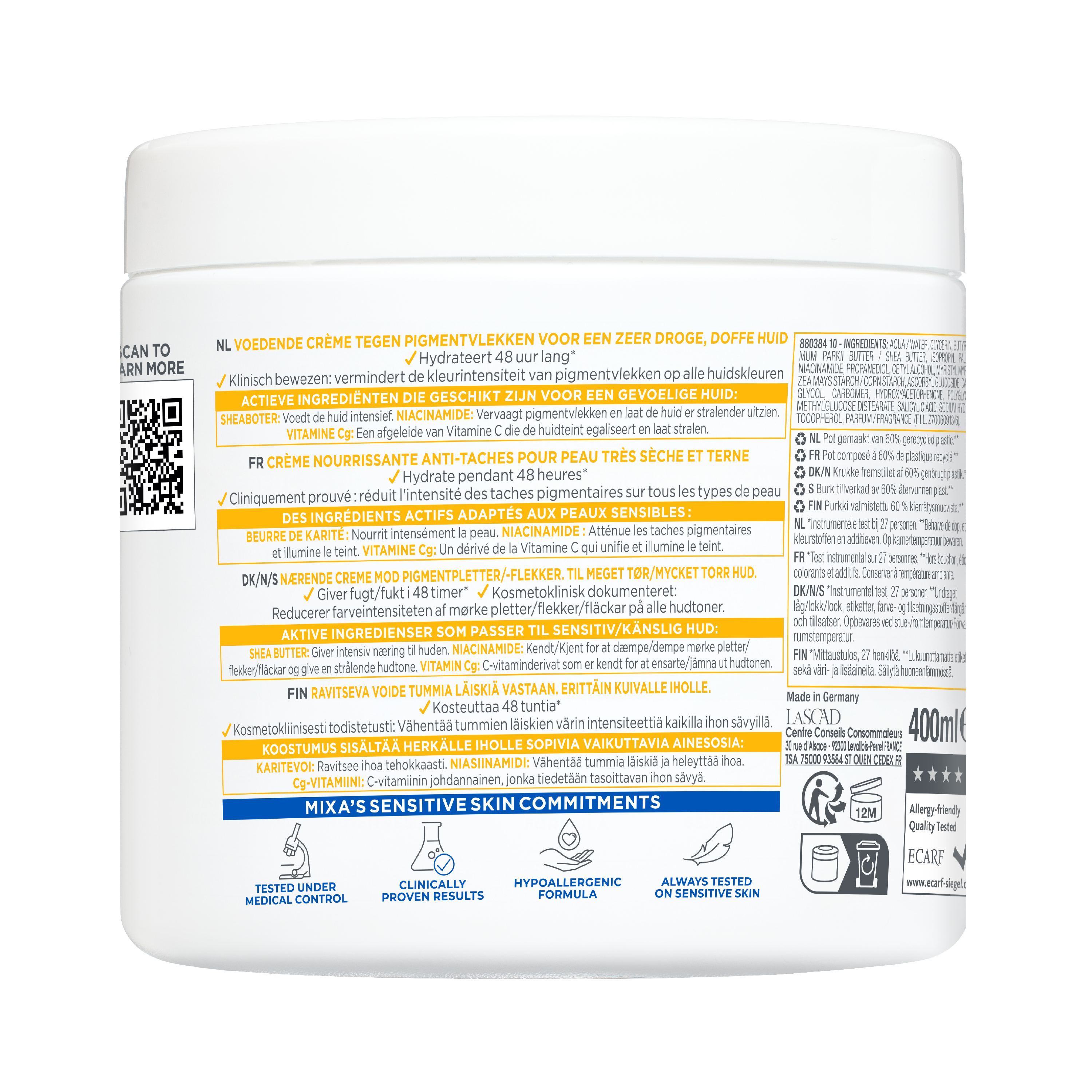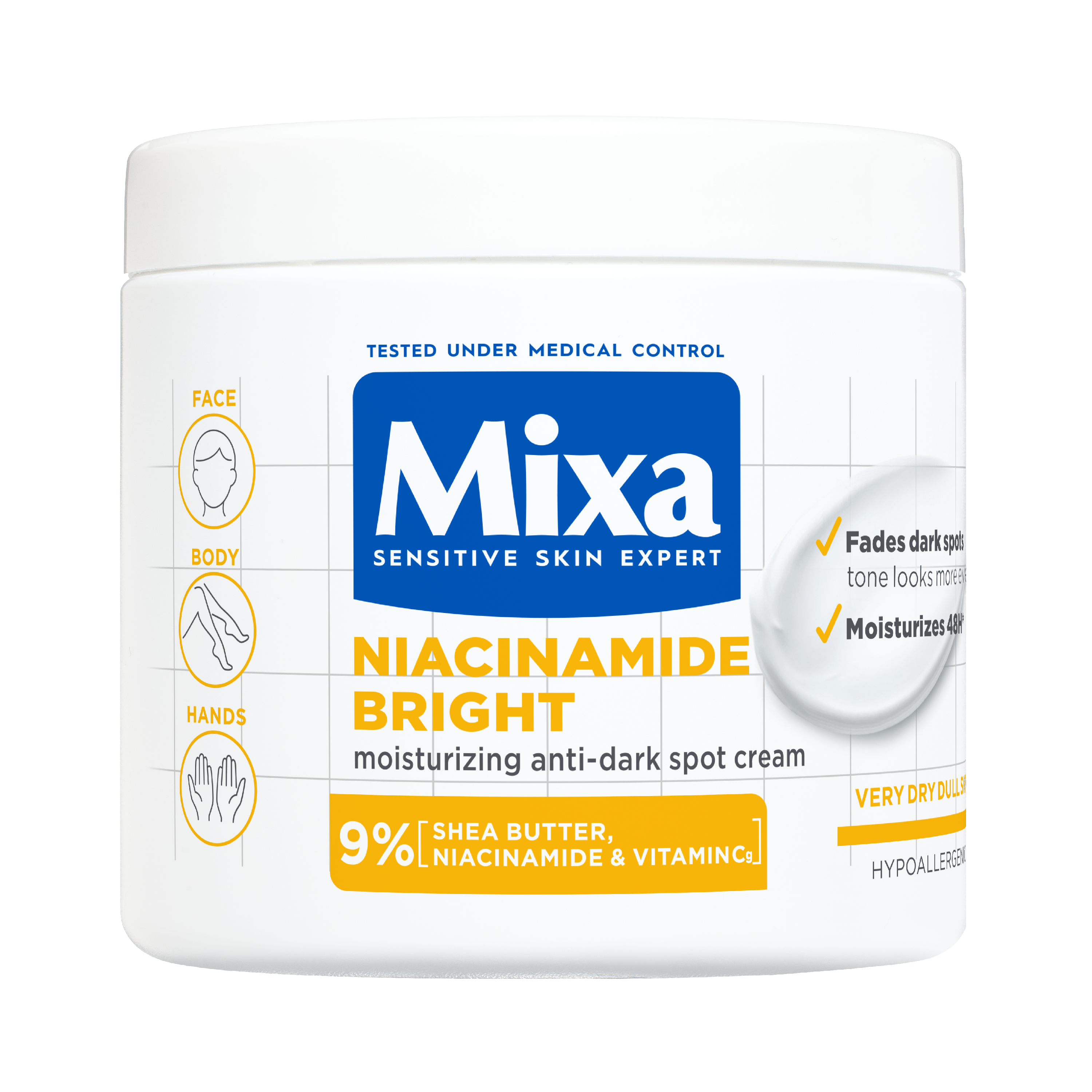 - Mixa Niacinamide Bright is een voedende crème speciaal ontwikkeld voor de zeer droge, doffe huid met pigmentvlekken, vaak veroorzaakt door blootstelling aan de zon, huidveroudering of onzuiverheden. Deze huid herken je aan donkere vlekjes op bijvoorbeeld het gezicht, de handen en het lichaam. Meestal ziet de huid er ongelijkmatig en dof uit. De crème helpt pigmentvlekken te verminderen en laat de huid stralen vanaf het eerste gebruik. De geavanceerde formule is verrijkt met 9% [SHEABOTER, NIACINAMIDE & VITAMINE Cg] en helpt de huid herstellen. Niacinamide vervaagt namelijk pigmentvlekken en helpt de huid beter haar eigen vocht vast te houden. Daarnaast helpt de formule, met sheaboter, de huid intensief te voeden en met vitamine Cg de huidteint te egaliseren voor een stralende gloed. Niacinamide Bright is klinisch bewezen effectief. Het vermindert de kleurintensiteit van pigmentvlekken op alle huidskleuren en laat de huid stralen. De crème hydrateert de huid 48 uur lang* en zorgt ervoor dat 88% van de gebruikers hun algehele huidconditie zag verbeteren na 56 dagen**. Tegelijkertijd voedt Niacinamide Bright de huid intensief en ondersteunt het de natuurlijke huidbarrière. Dit zorgt voor een egalere huid met een frisse, gezonde glow en minder zichtbare pigmentvlekken. Al 100 jaar lang focust Mixa op het ontwikkelen van effectieve formules voor een gevoelige huid. Mixa producten zijn hypoallergeen geformuleerd en altijd getest onder medische controle. Zo weten we zeker dat onze crèmes geschikt zijn voor een gevoelige huid. Dit geldt ook voor de Niacinamide Bright crème van Mixa, die gebruikt kan worden als gezichtscrème, bodylotion en handcrème. De 3-in-1 crème trekt snel in, heeft een niet vette textuur en is geschikt voor dagelijks gebruik. De formule bevat een subtiel parfum met zonnige noten, witte bloemen, romige musk en frisse citrus.