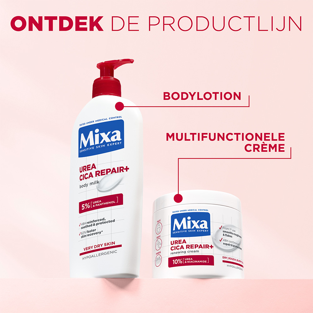 - De Mixa Urea Cica Repair Bodylotion is speciaal ontwikkeld voor de droge, ruwe huid die een rijke verzorging nodig heeft. De geavanceerde formule, verrijkt met 5% [UREA & PANTHENOL], laat de huid glad aanvoelen en vermindert langdurig een trekkerig gevoel. Urea staat er om bekend dat het de huidvernieuwing ondersteunt, waardoor ruwheid minder wordt. Panthenol heeft een kalmerende werking en helpt de huidbarrière te herstellen. Het resultaat? De huid voelt 48 uur lang versterkt, verzacht en beschermt aan.*